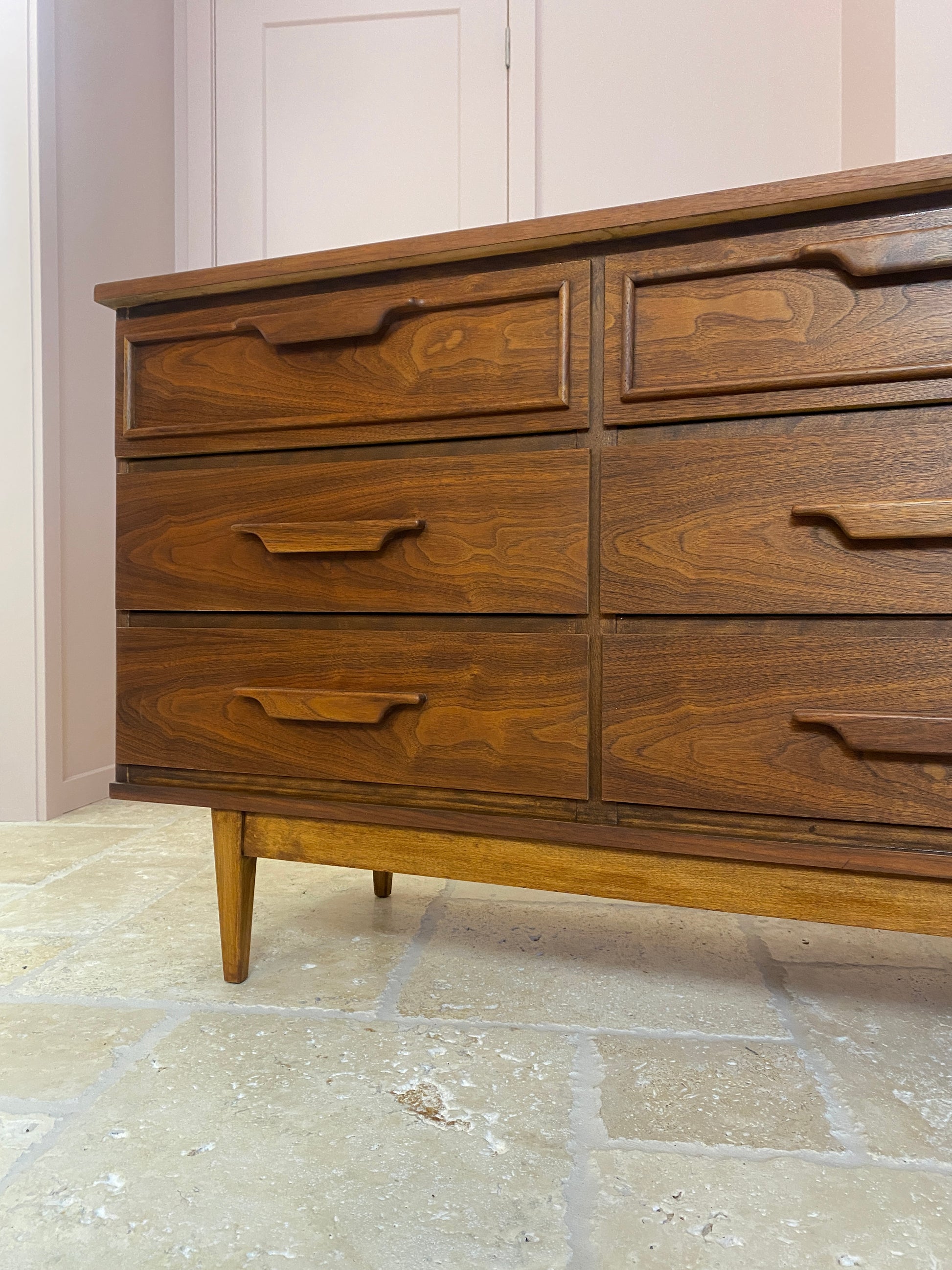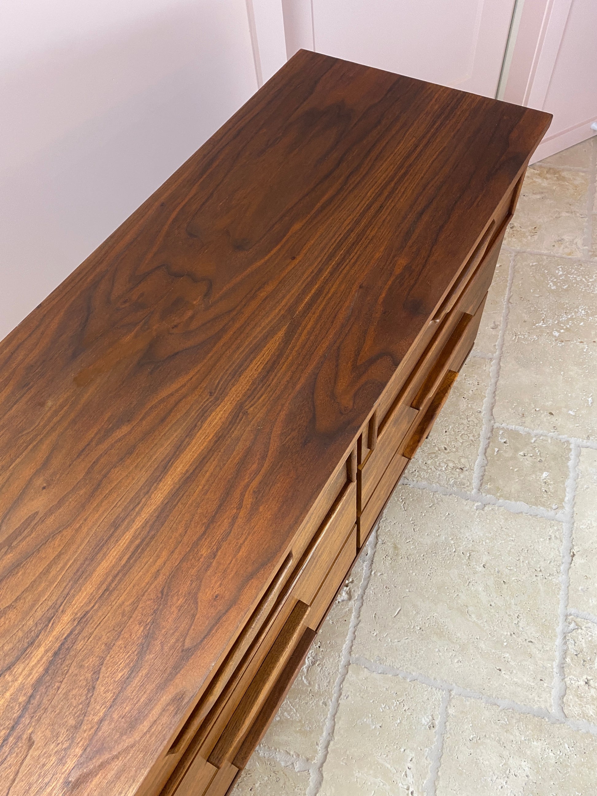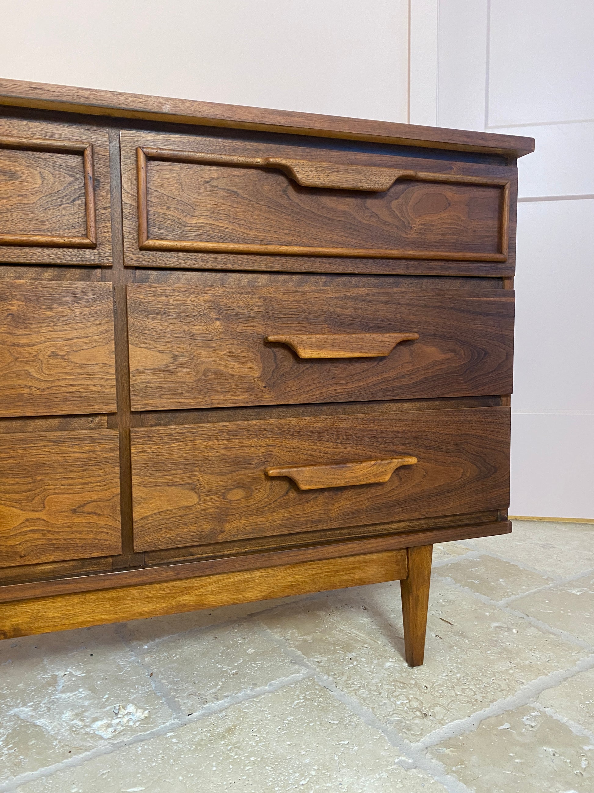 This vintage Mid-Century Modern dresser has been fully refinished to highlight the stunning walnut woodgrain. It’s the perfect nine-drawer dresser, offering both beauty and functionality.