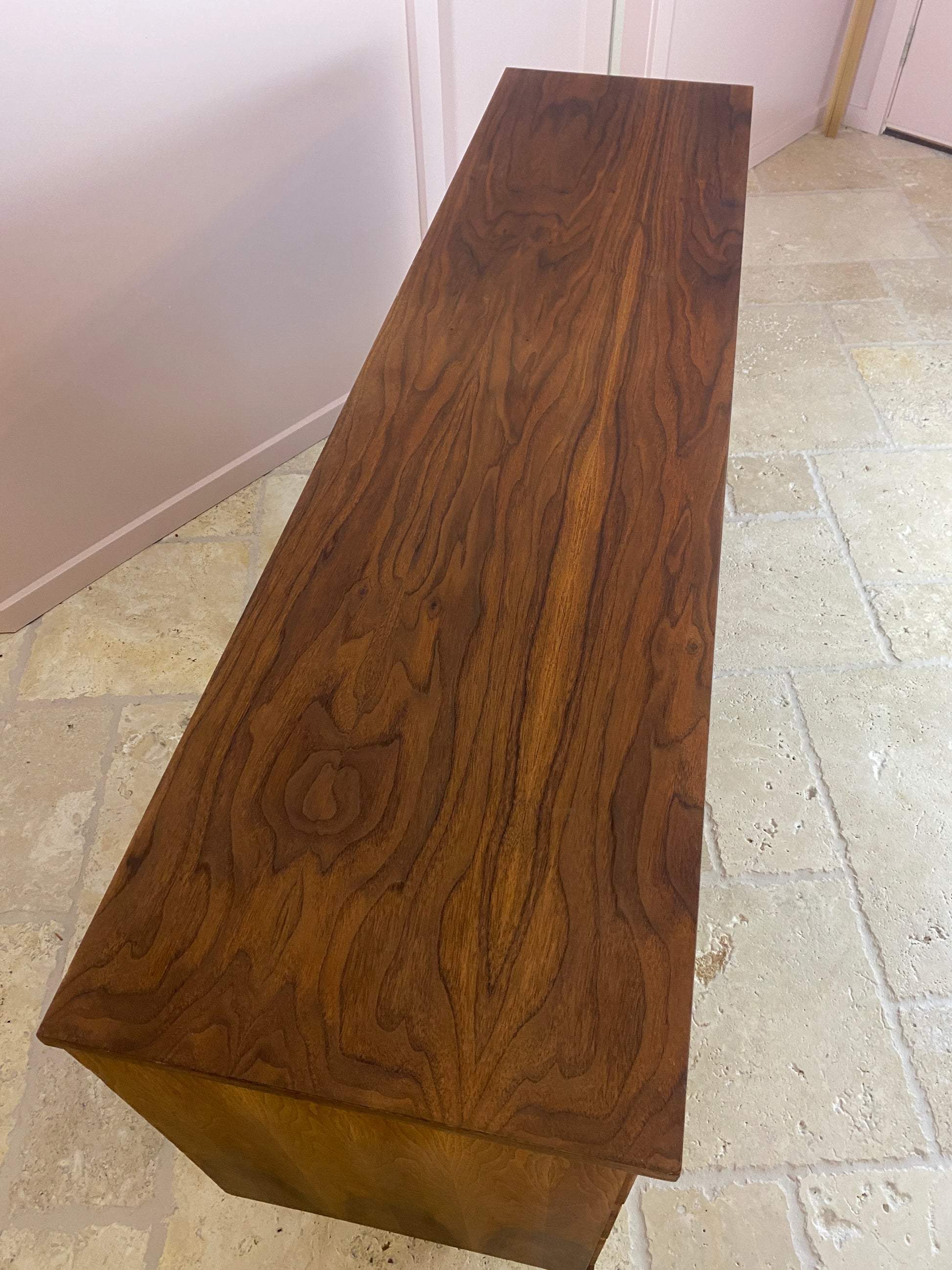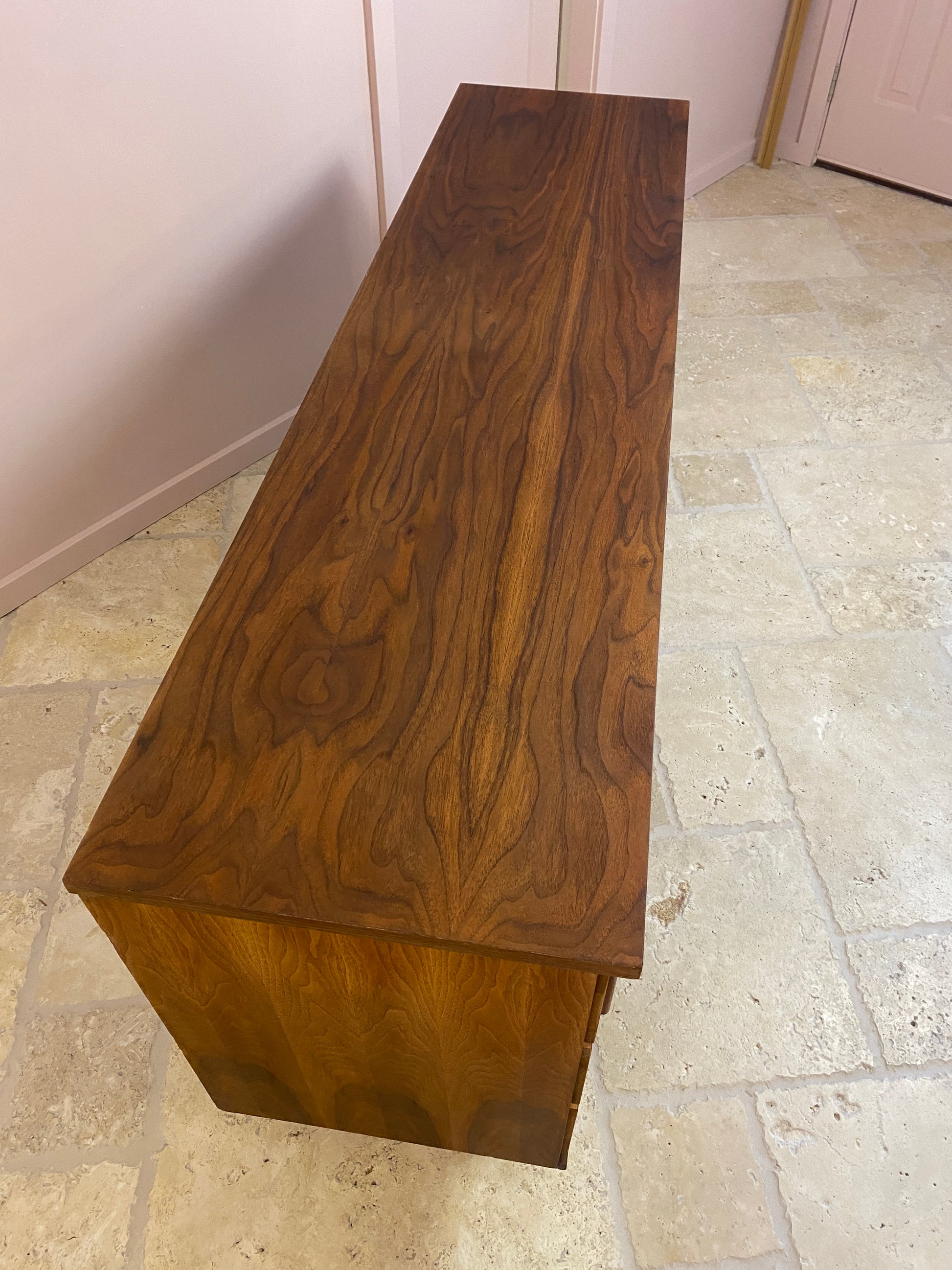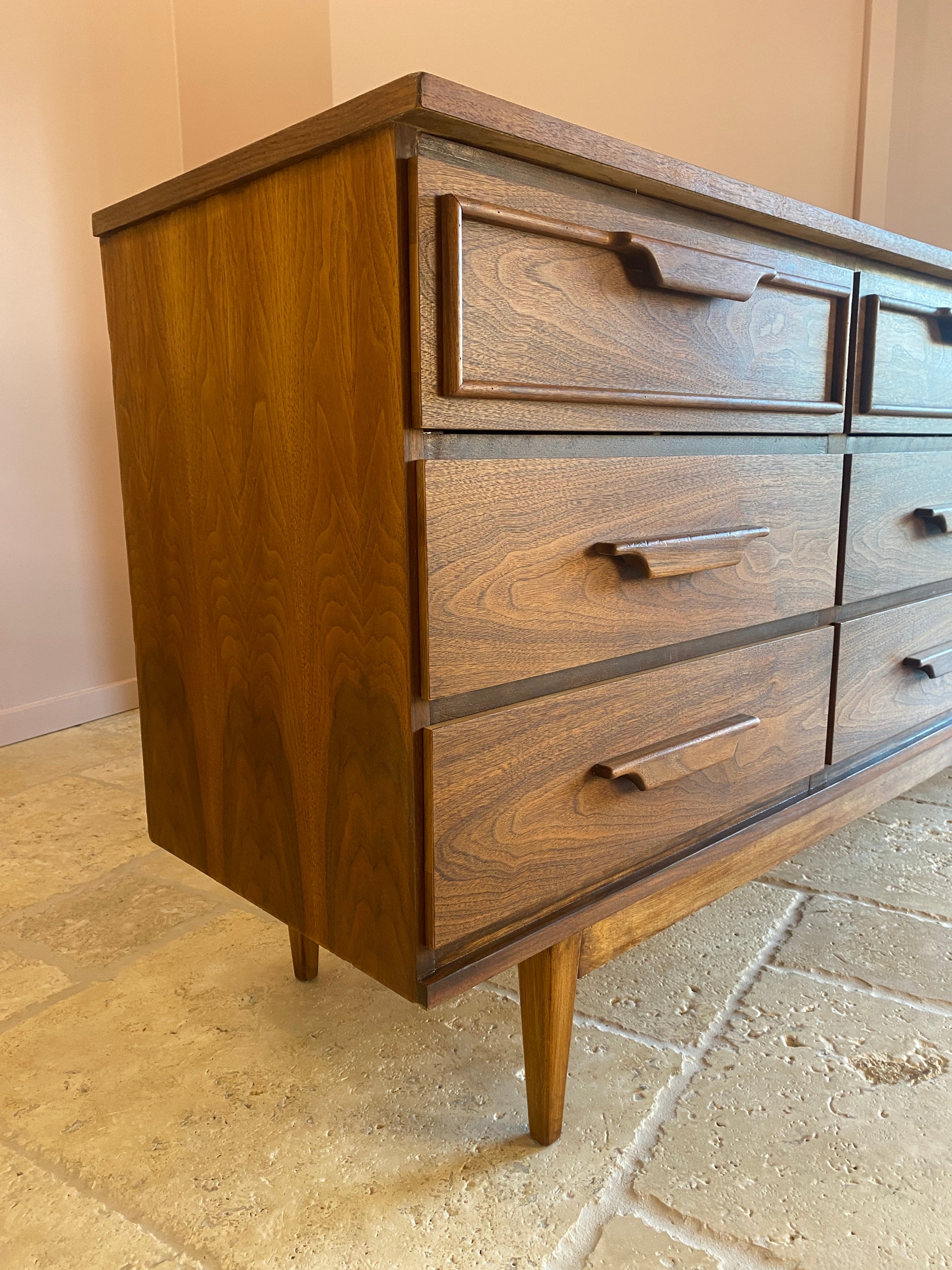 This vintage Mid-Century Modern dresser has been fully refinished to highlight the stunning walnut woodgrain. It’s the perfect nine-drawer dresser, offering both beauty and functionality.