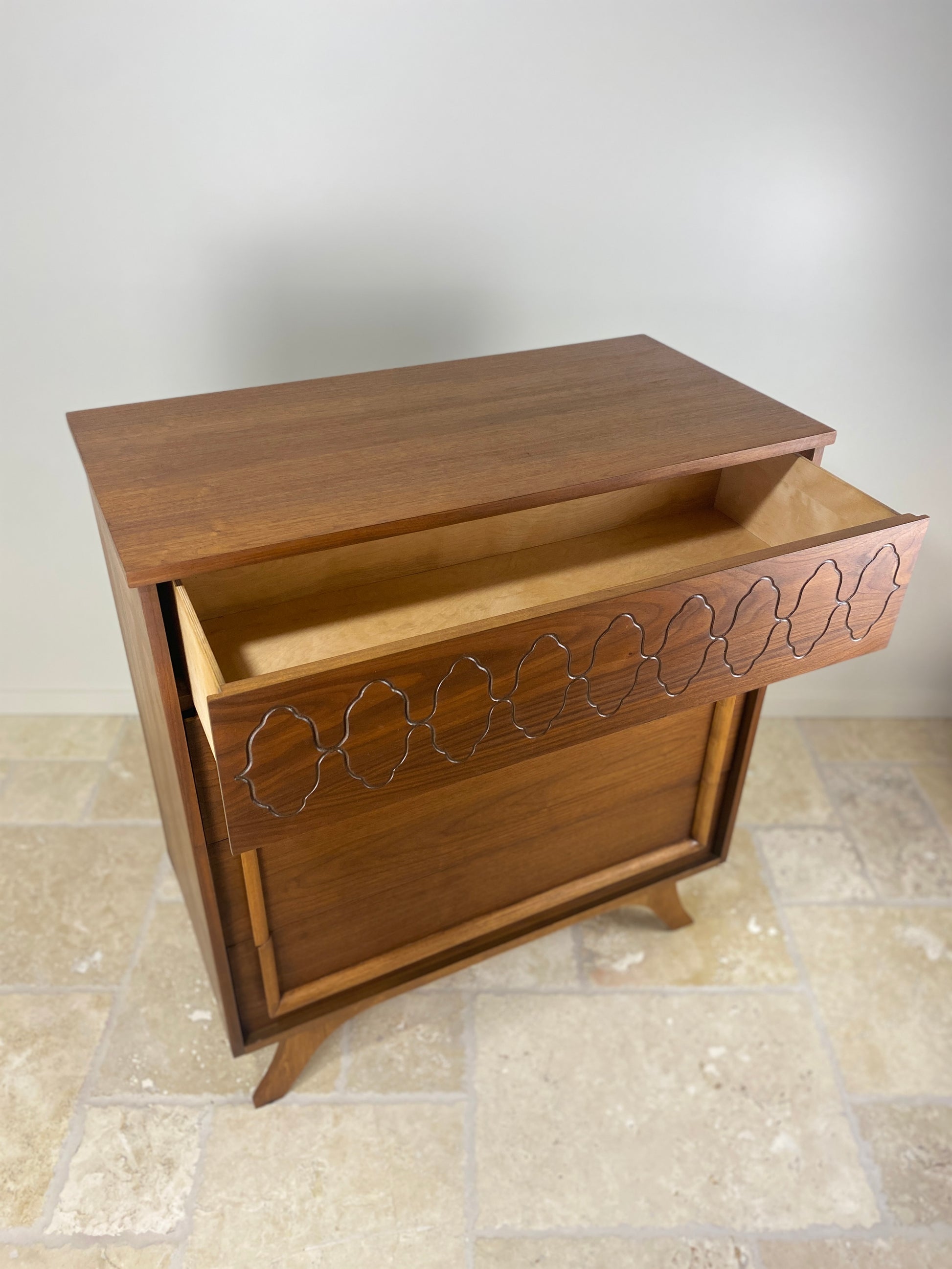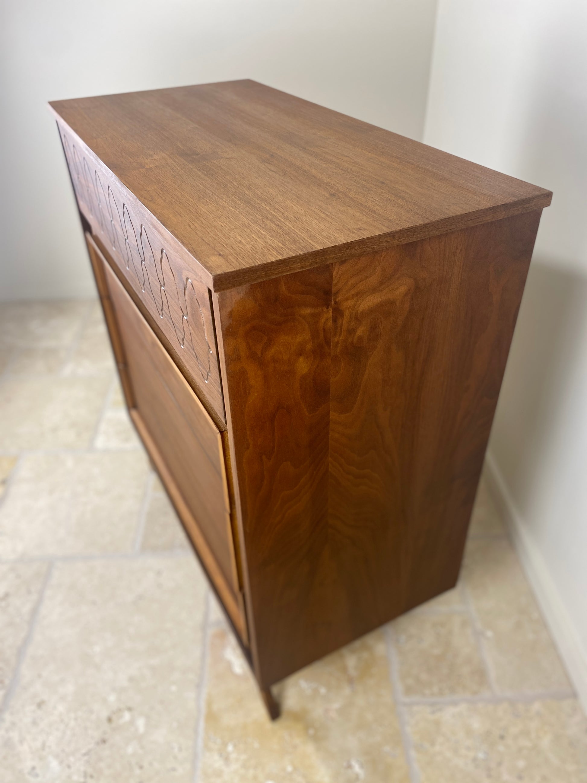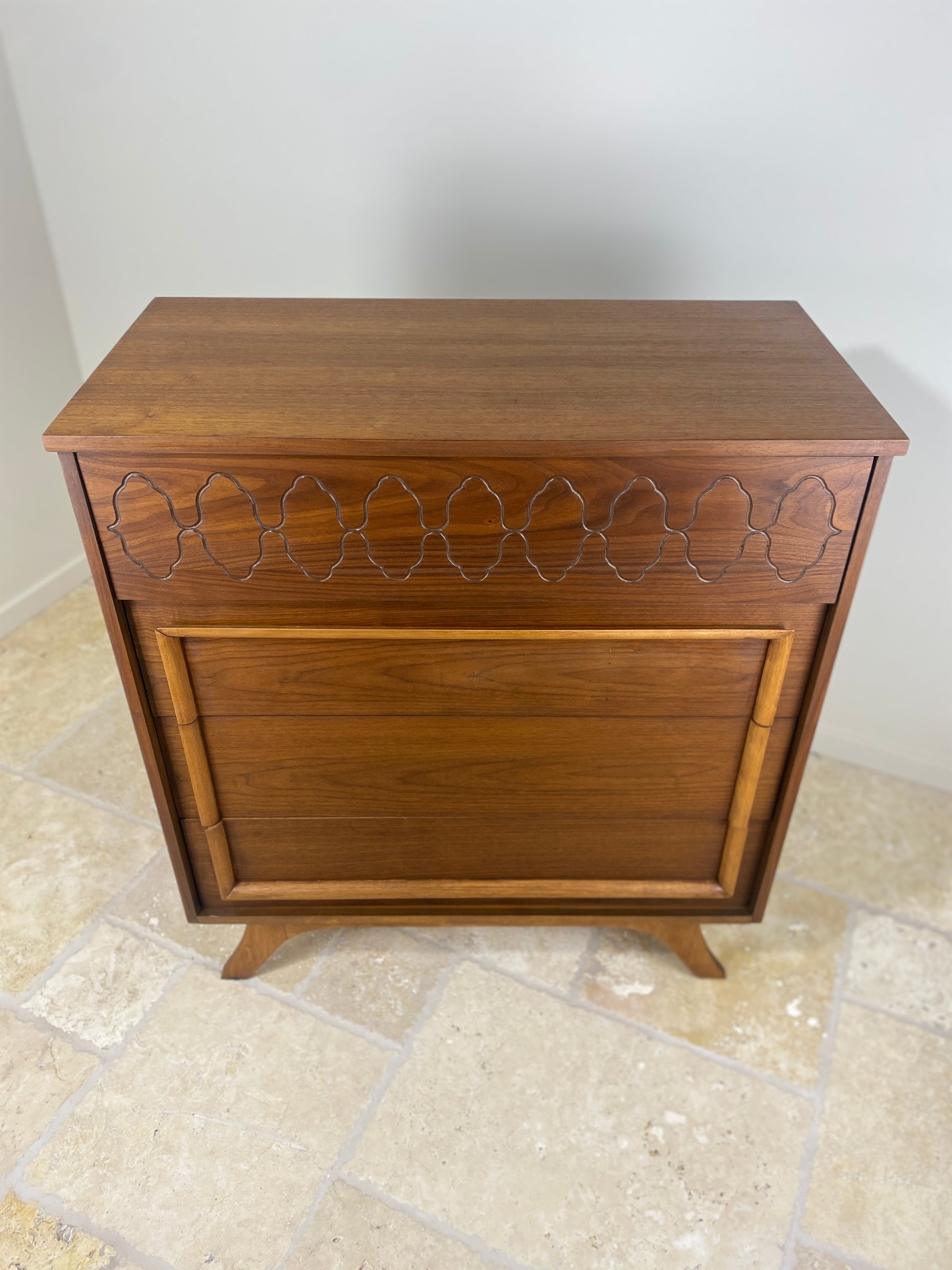 Mid Century Modern Tall Walnut Dresser with front angled legs and 4 drawers