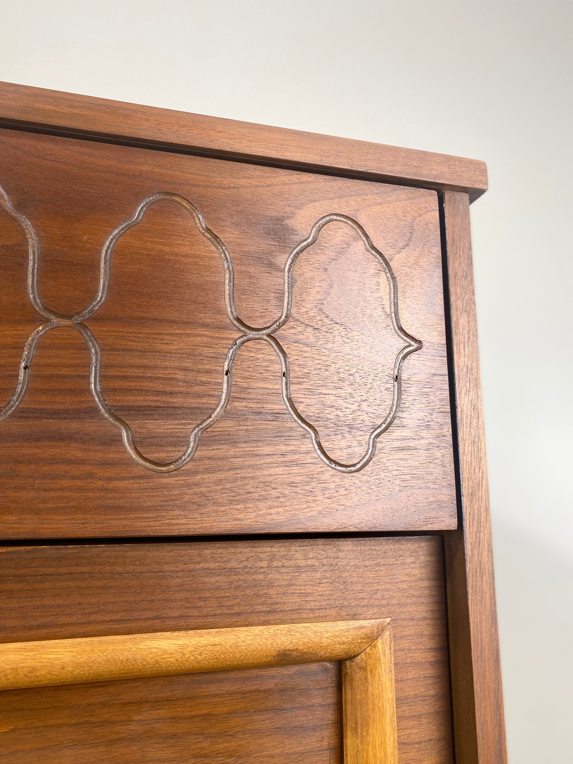 Made from premium cuts of walnut, the Arabesque inlay design on the top drawer adds texture and character. The top drawer has a recessed pull underneath for smooth operation and the remaining drawers have decorative wood-frame which doubles as drawer pulls.