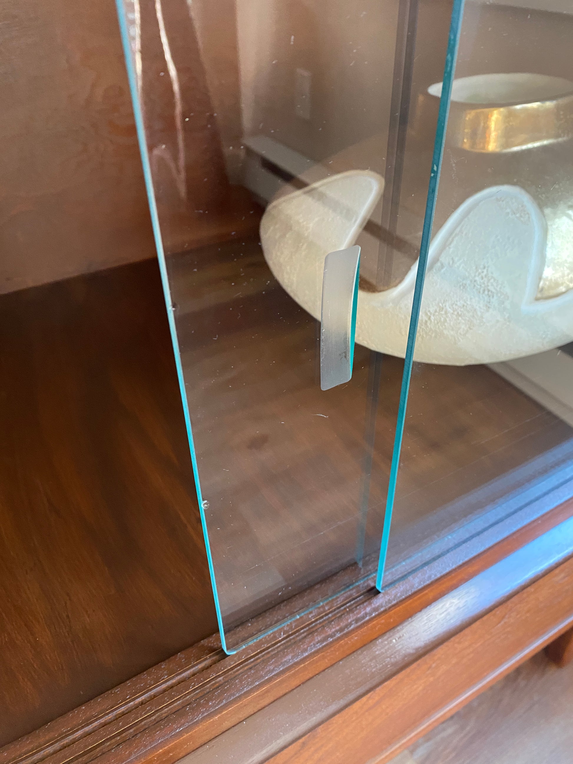 The left side of the cabinet includes three drawers, while a long drawer beneath the sliding glass doors provides additional storage. Sculpted wooden drawer handles add an elegant touch to the design. The drawers open and close smoothly, with clean and well-maintained interiors.