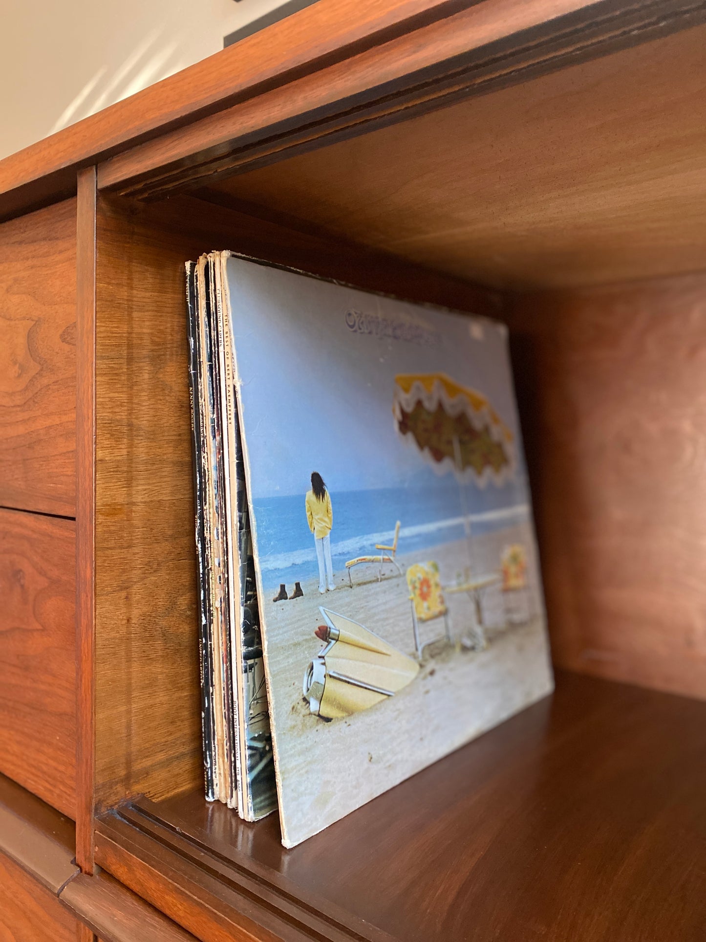 The open storage area behind the glass fits record albums: L: 30.5” x H: 13.5”
